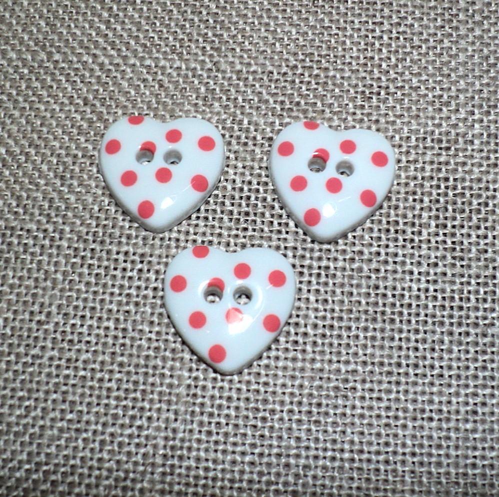 Bouton cœur blanc à pois rouge framboise 15mm avec 2-trous
