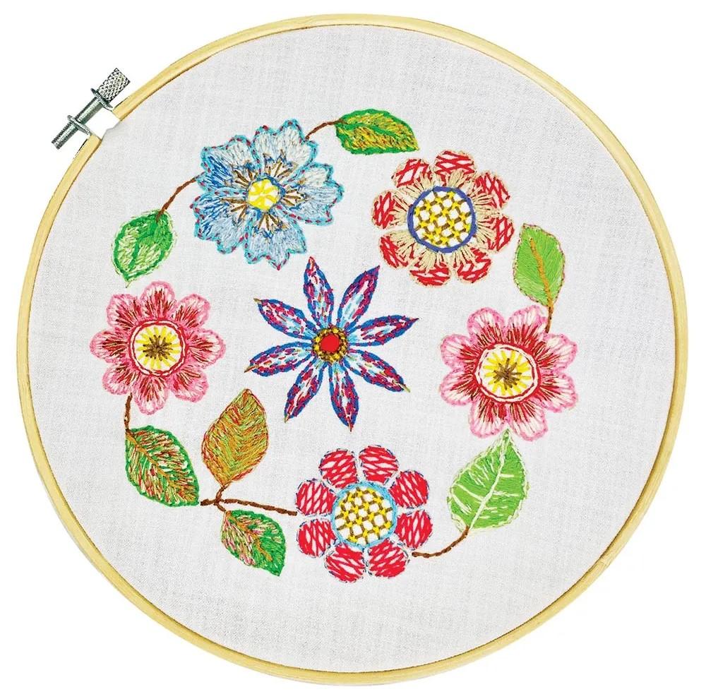 Ce kit vous permet de broder un motif joyeux orné de fleurs colorées.