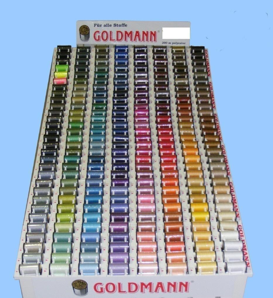 246 bobines fil à coudre Goldmann de 200 mètres chacune, idéales pour tout les tissus et le fil invisible clair et foncé, fil lurex doré et argenté à 100m